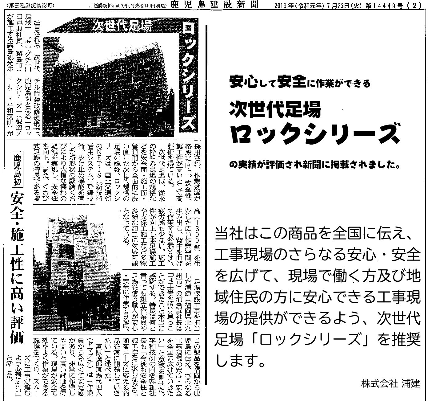 2019年7月23日(火)の鹿児島建設新聞に、次世代足場「ロックシリーズ」の実績と社長のインタビューが掲載されました。